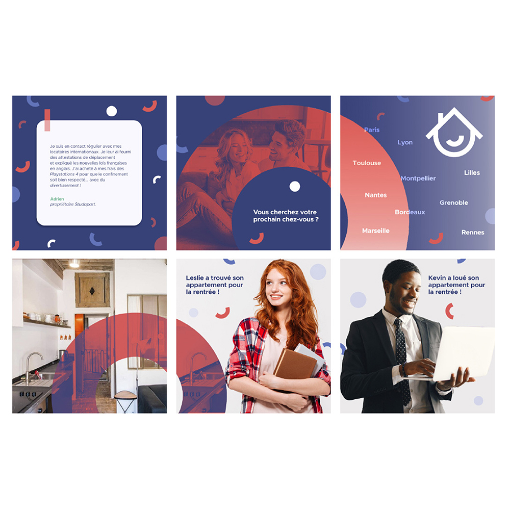 Pour cette DA, j’ai décidé d’utiliser le rouge en plus grande quantité afin d’apporter plus de chaleurs etde renforcer l’aspect social sur instagram. L’utilisation desmotifs apporte un coup de frais aux visuels et permet de casser les applats de couleurs.
